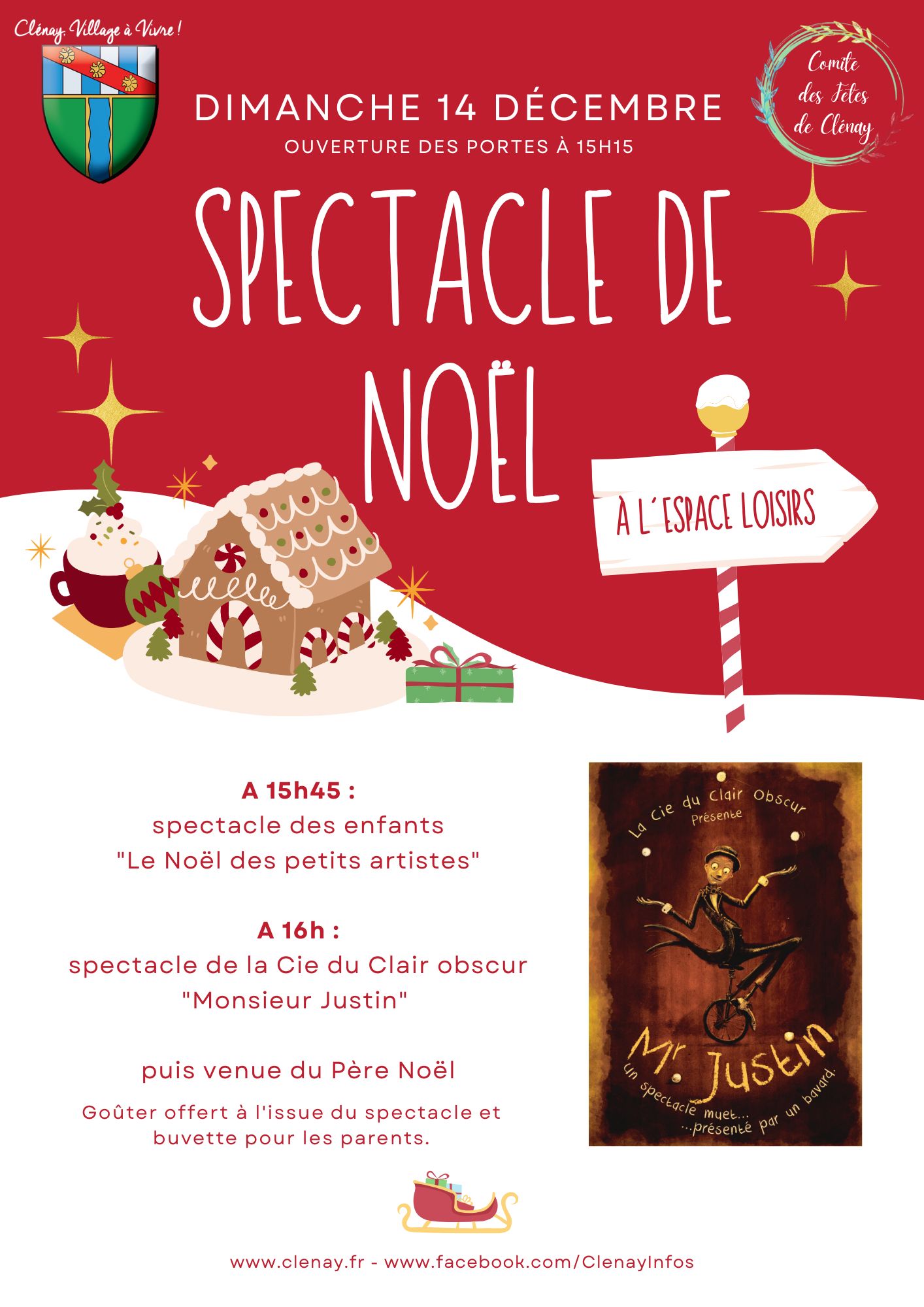 Spectacle de Noël + Ajouter à mon Agenda Google + iCal / Outlook export 00 jours 00 heures 00 minutes 00 secondes Étiquettes : noël, Père Noël, spectacle Prénom Nom Adresse mail Adresse Abonné(e) à la page Facebook Oui je suis abonné/Non je ne suis pas abonné Abonné(e) à PanneauPocket Oui je suis inscrit(e)/non En cochant cette case, j’autorise la mairie de Clénay à utiliser mes informations pour les communications municipales. Envoyer